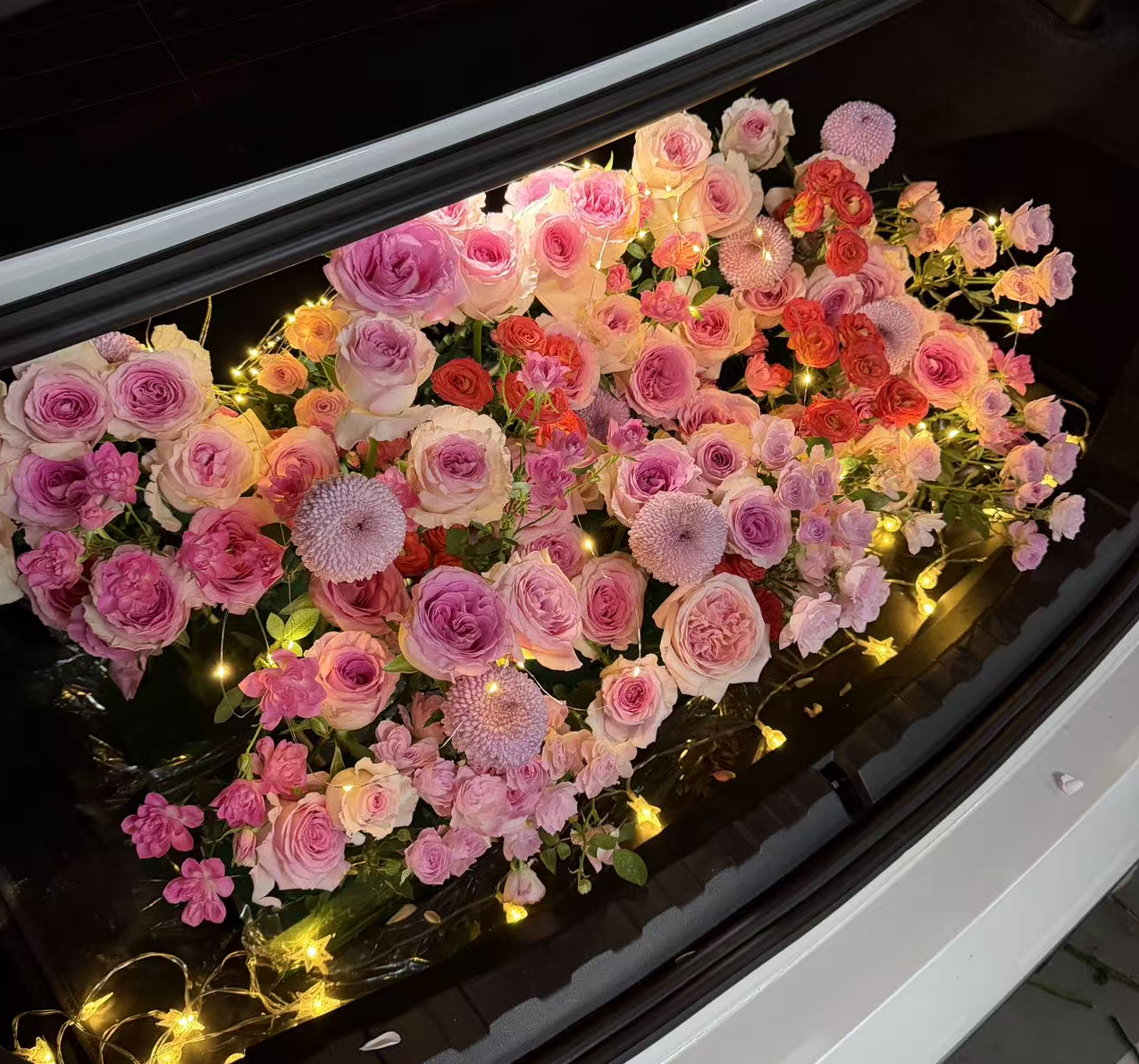 布置了满满一后备箱的鲜花,第一次插还挺好看